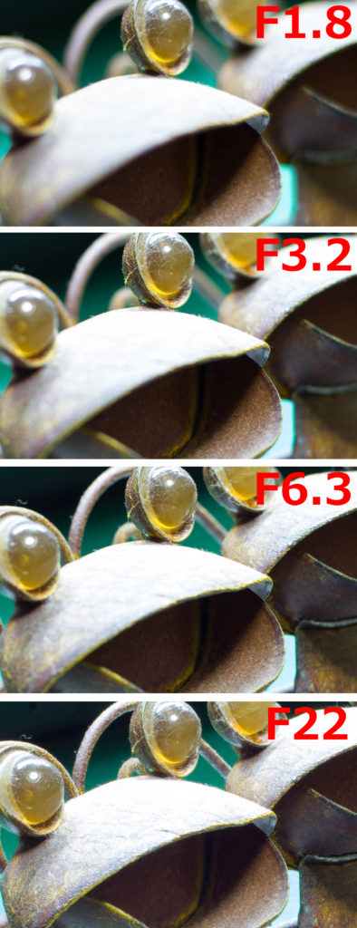 絞り込む(F値を大きくする)ほど、どんどん焦点が合っていくのが分かると思います。