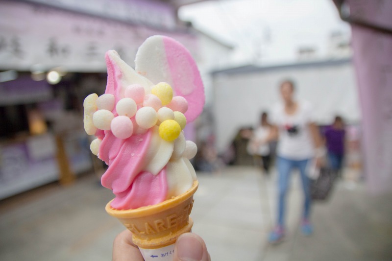 「おいり」がソフトクリームにくっついて出てきます。