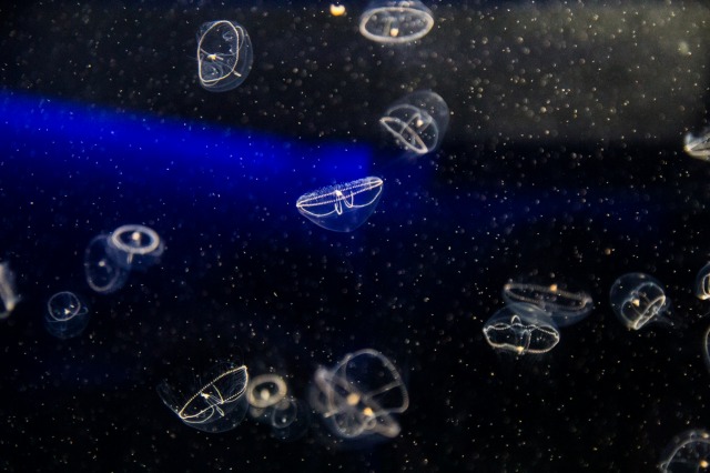 ちっちゃくて可愛いのはシロクラゲ。親指の先っちょくらいのサイズがプカプカと浮いています。