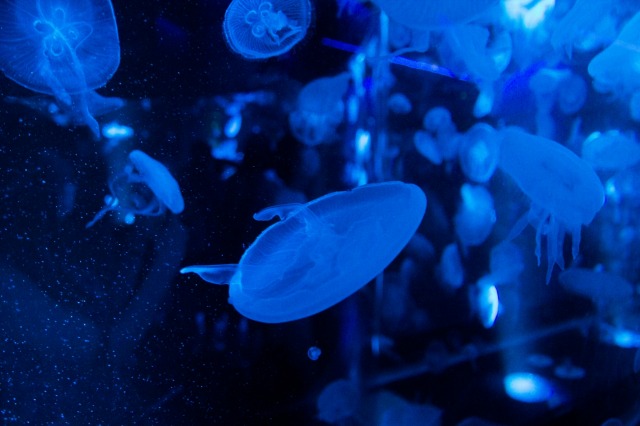手前から奥までクラゲ、クラゲ、クラゲって感じです。照明がすごい雰囲気だしてくれてます。クラゲ、体が半透明なだけあって照明の色によって見え方がすごい変わるんですよね。