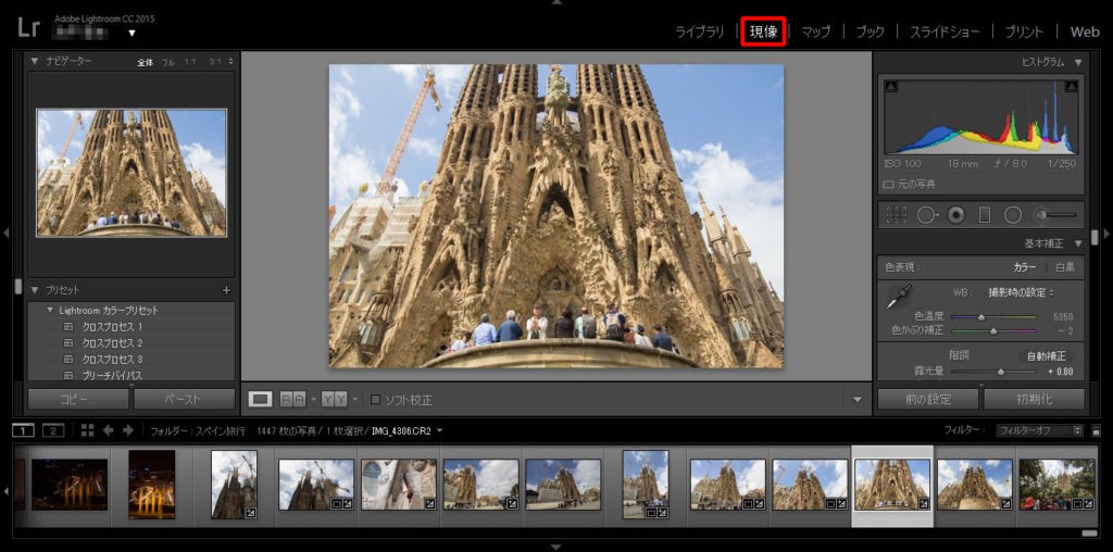 先程の画面で右下の「読み込み」をクリックすると、読み込みが完了します。これでいよいよレタッチが出来るようになります。試しに読み込んだ写真を選択した状態で、右上の表示されているモジュールの「現像」を選択してみましょう。