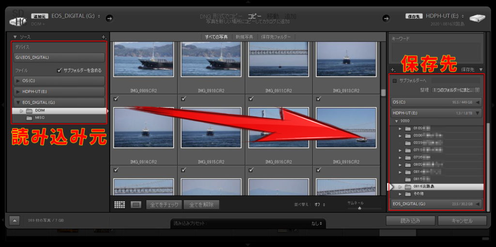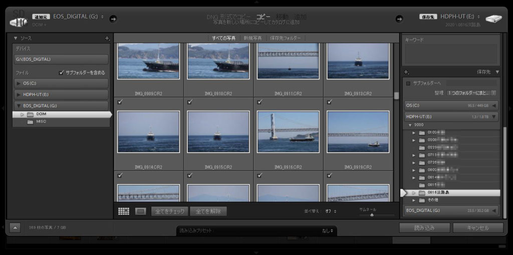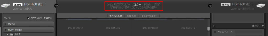 上部では読み込み方式が選択できます。4種類、「DNG形式でコピー」「コピー」「移動」「追加」が選択できます。