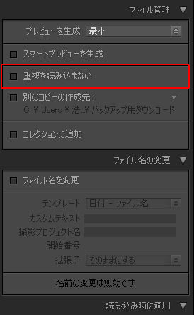 そして、右側には読み込み時の設定が記載されています。「重複を読み込まない」にチェックをいれておけば誤って同じ写真を取り込んでしまう事故が防げるのでオススメです。