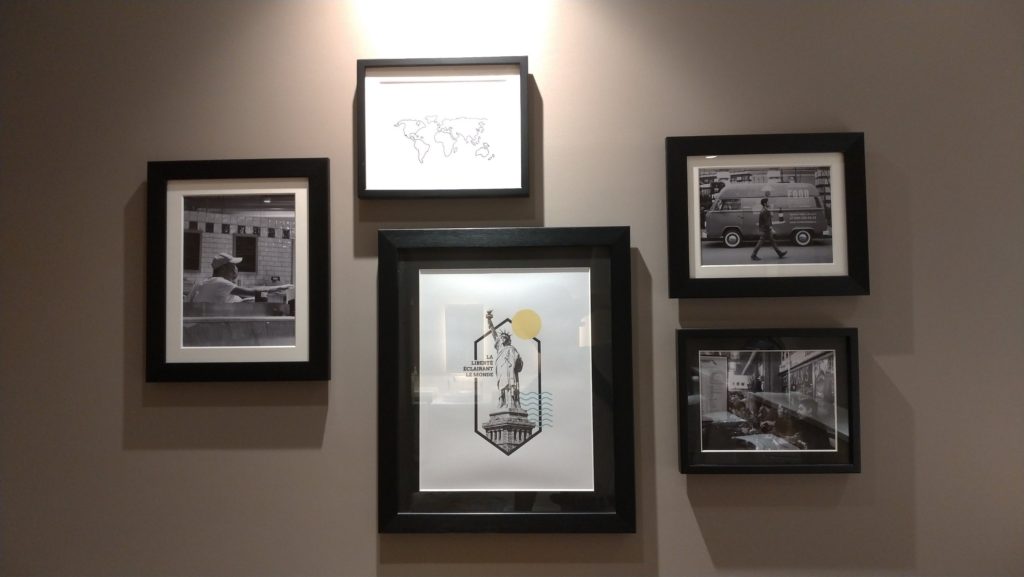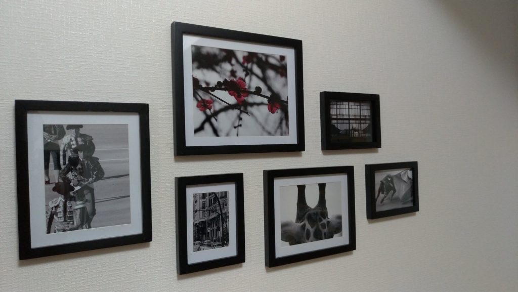 街中の同じような展示を参考にしたりしましたが、よくあるのが1枚主役をセンターに決めて、その周りに小さい額縁を縦・横に変化を付けながら並べていくパターン。