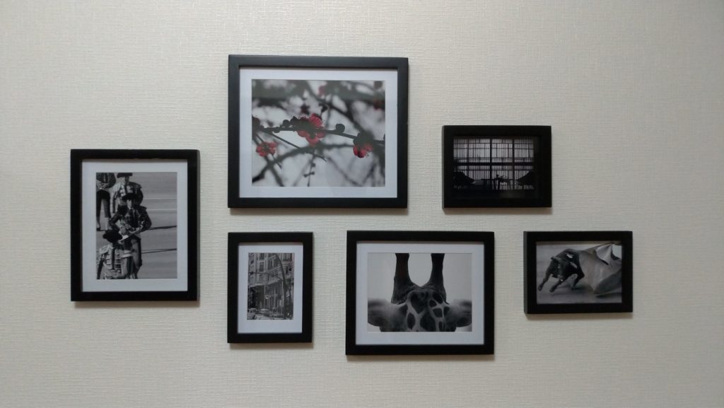 街中の同じような展示を参考にしたりしましたが、よくあるのが1枚主役をセンターに決めて、その周りに小さい額縁を縦・横に変化を付けながら並べていくパターン。