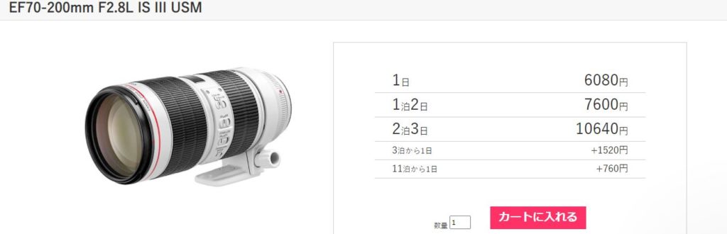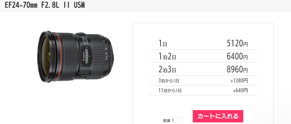 やっぱり値段が気になりますよね。これはレンズによってまちまちなのですが、キヤノンユーザーの憧れの所謂“大三元レンズ”を試しに借りた場合、いくらになるのか調べてみましょう。