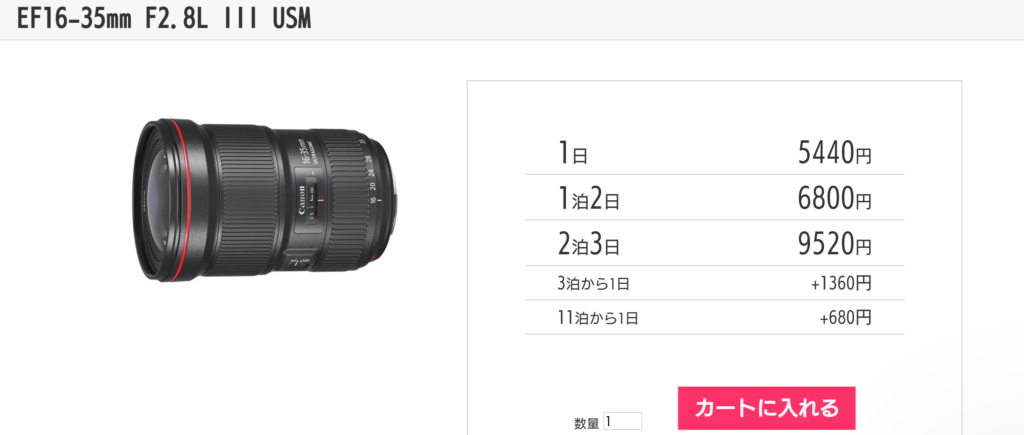 今日のお出かけは広角で是非撮りたいロケーションがある!ってんなら最短1日なら5,440円。今買うと24万ほどする。ギョエェ。
