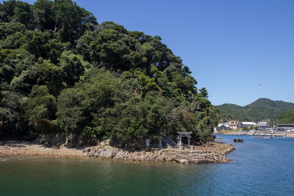 出港するとすぐに一般人の立ち入りが許可されていない禁足地となっている神社のある島が見えてきます。