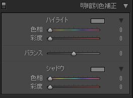 ハイライト部分・シャドウ部分それぞれに対し色相で色味を選び、彩度に応じてどの位色味を乗せるか調整することが出来ます。