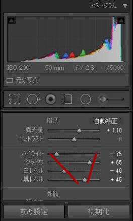 また、写真内の最も暗い部分である「黒レベル」が力強い影を描いてしまうことを防ぐため、こちらも連動して少しだけ引き上げます。