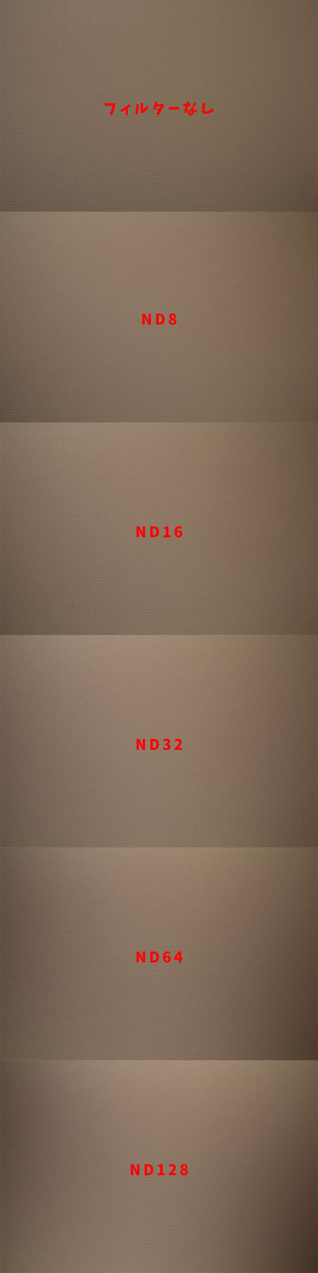 一気にいきますよ、フィルター無しの状態からND8~ND128まで、各段階でセットした時の映り具合を並べます。